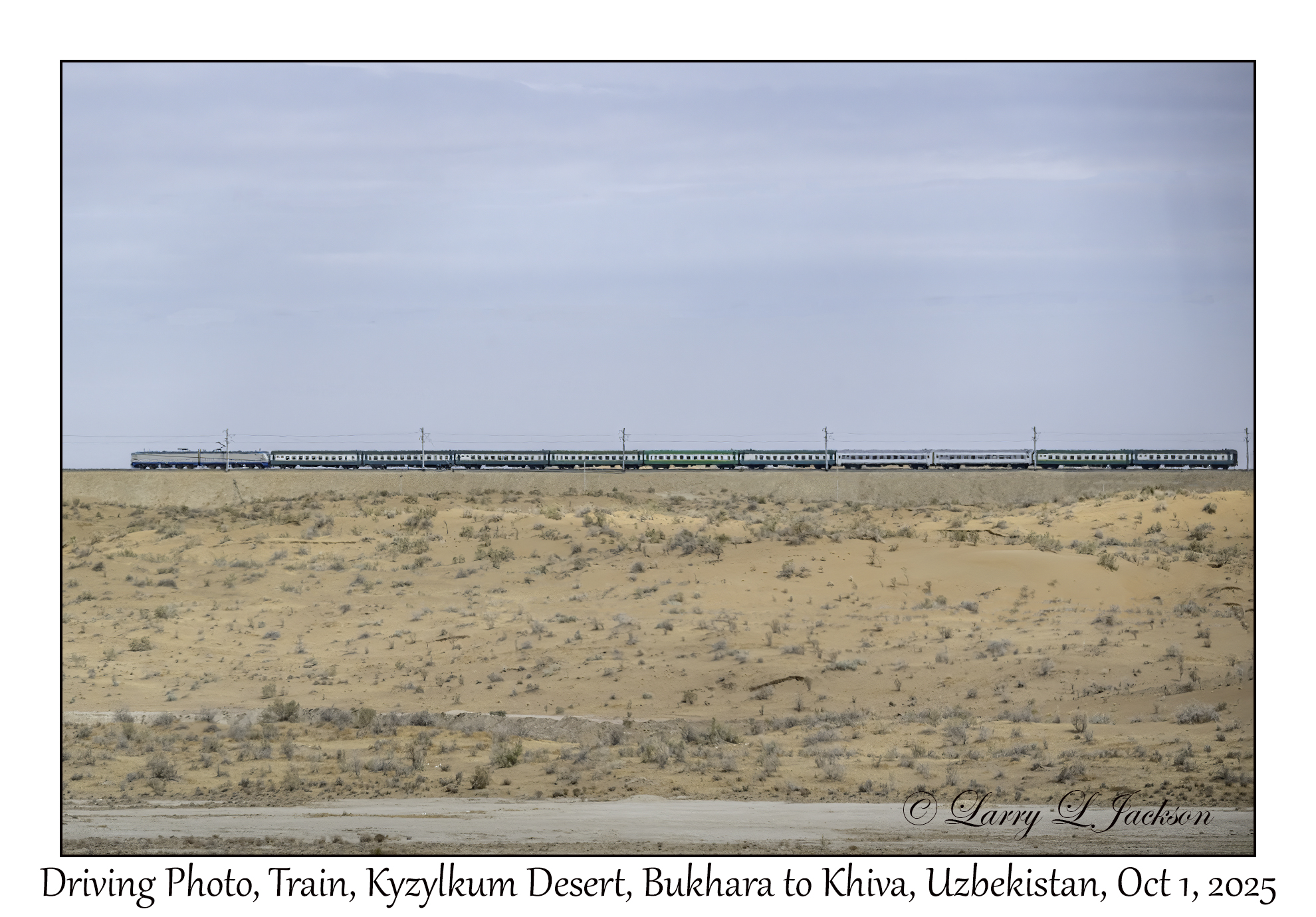 2025-10-01#2867 Driving Photo, Train, Kyzylkum Desert, Bukhara to Khiva, UzbekistanLarry L. Jackson