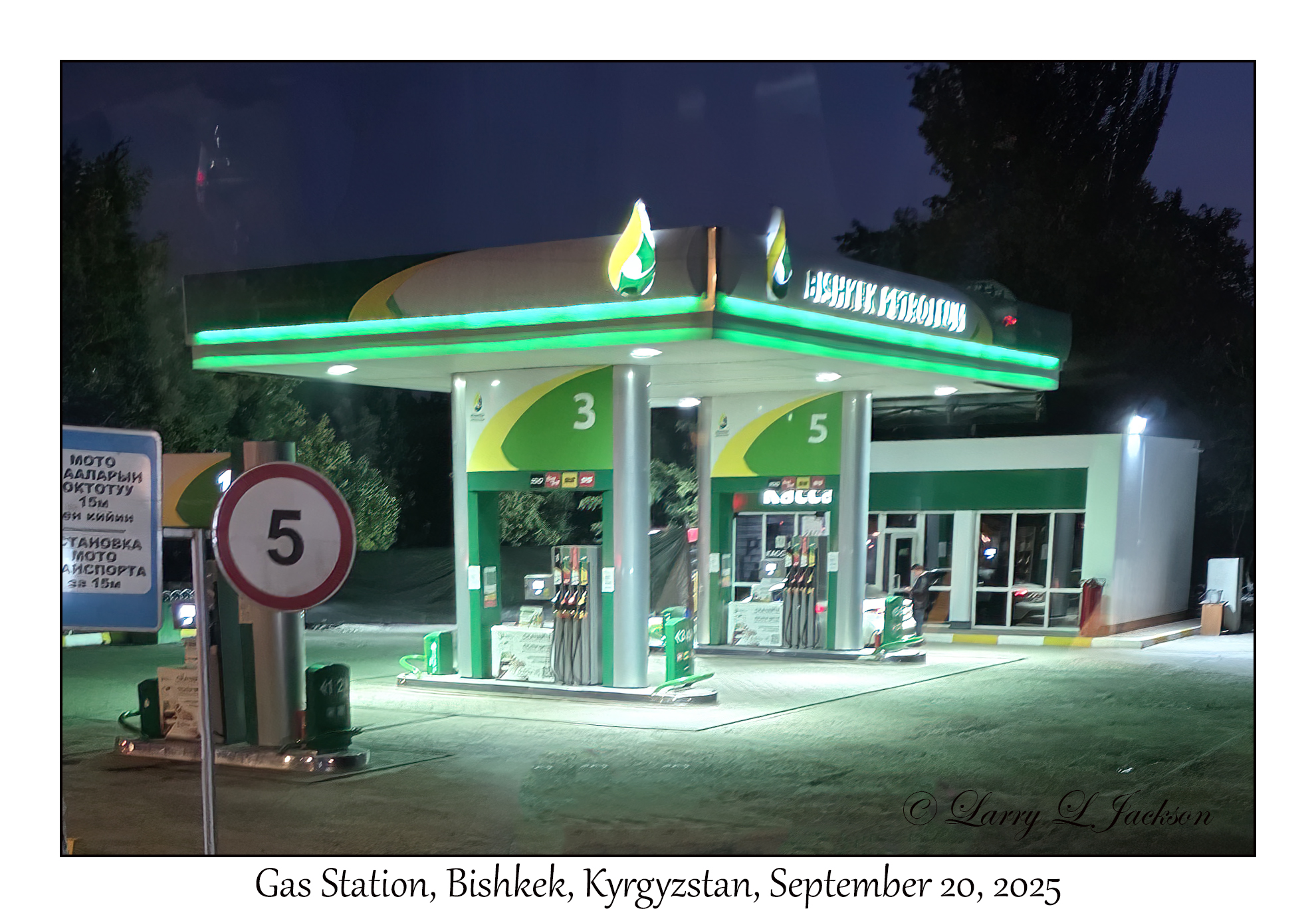 Gas StationArriving after sunset, the first photo in Kyrgyzstan.Bishkek, Kyrgyzstan, September 20, 20252025-09-20#3742Larry L. Jackson