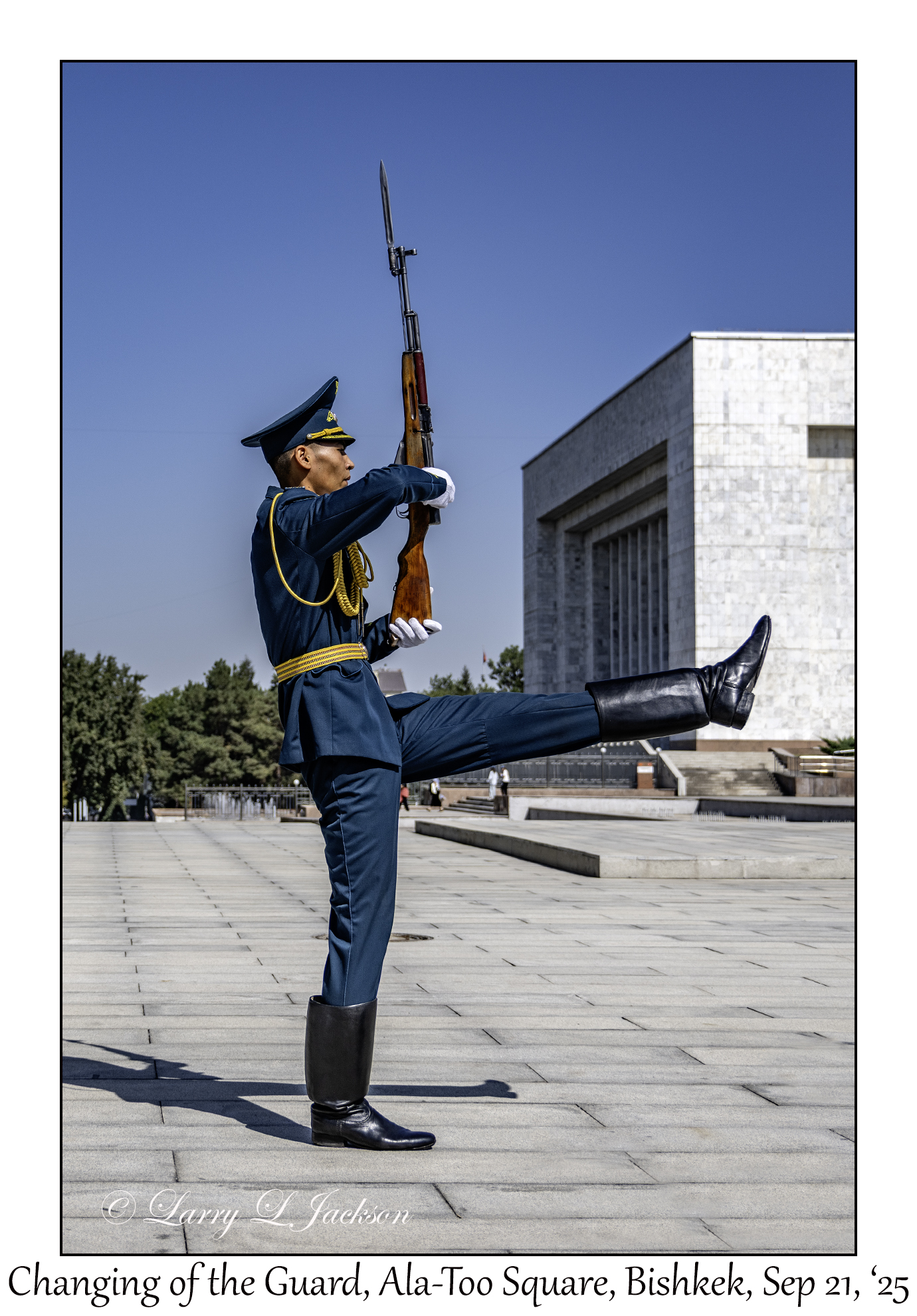 Changing of the GuardIt is hard to believe that this guard can perform the ceremonial march after standing guard for an hour.Ala-Too Square, Bishkek, Kyrgyzstan, September 21, 20252025-09-21#0048Larry L. Jackson