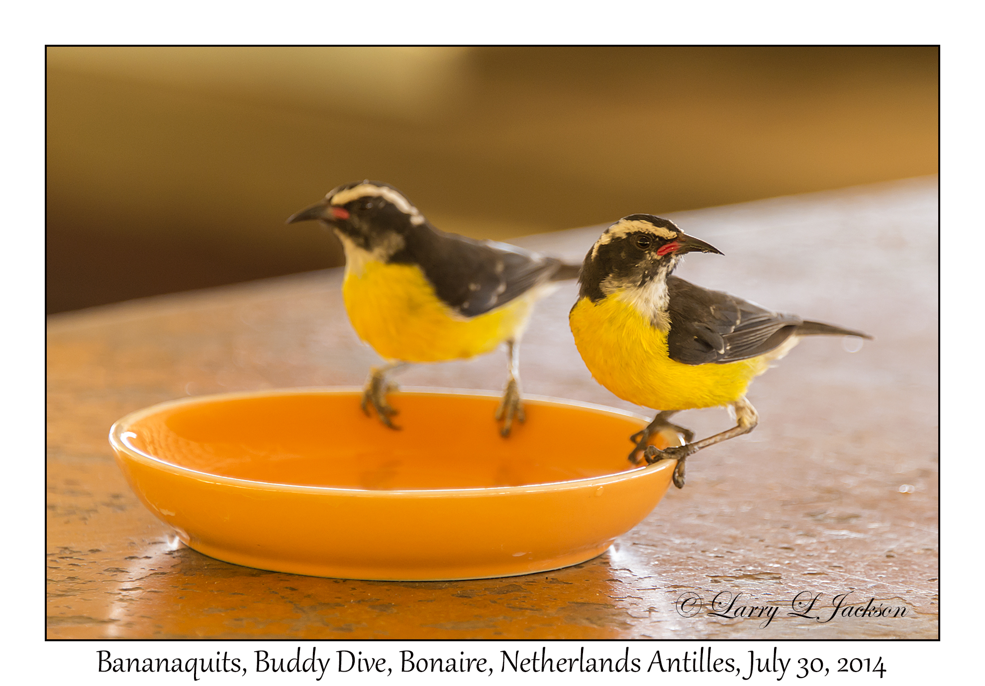 BananaquitsCoereba flaveola - having some sugar water.Buddy Dive, Bonaire, Netherlands Antilles, July 30, 20142014-07-30#5032Larry L. Jackson