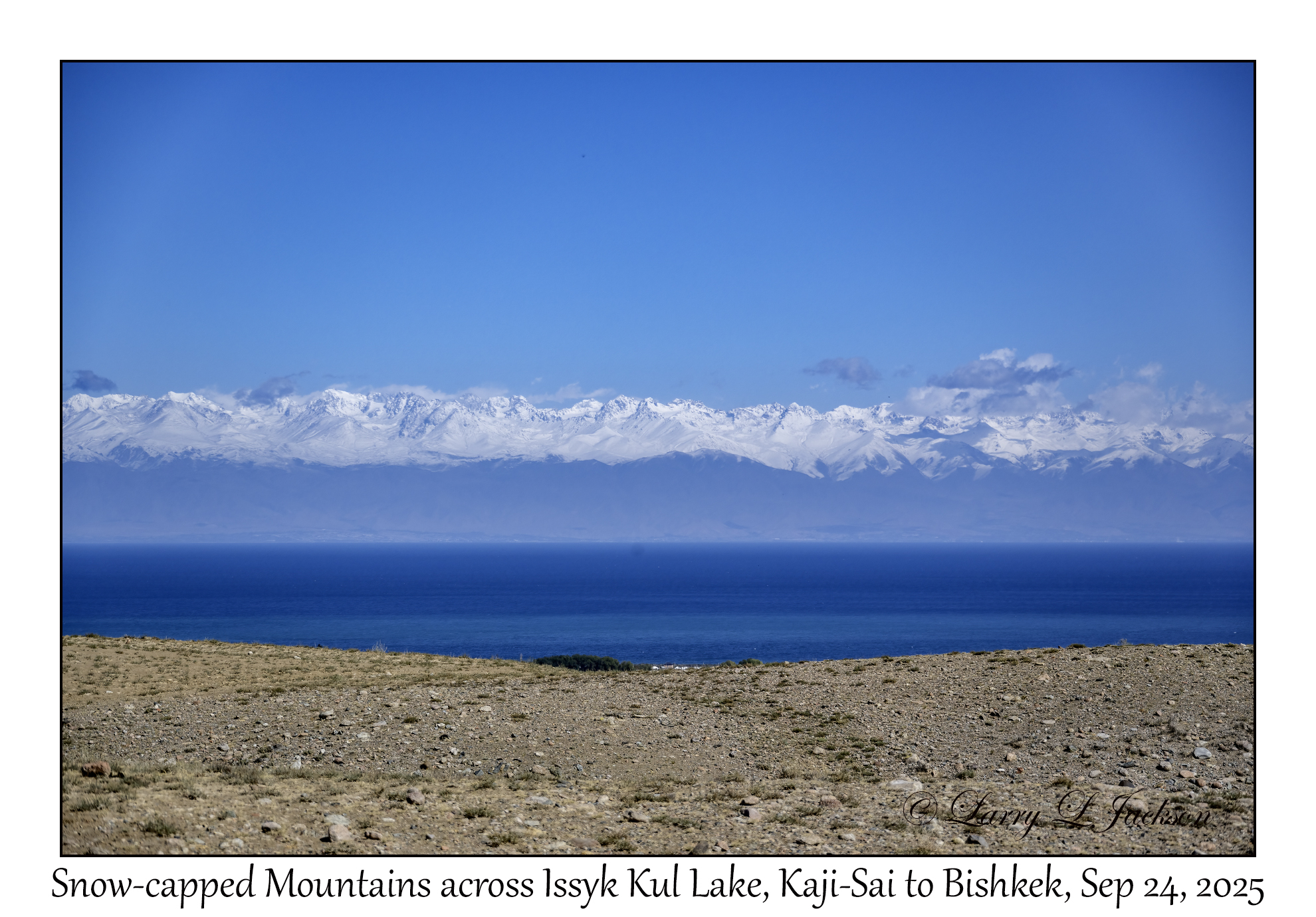 Snow-capped Mtns across Issyk Kul LakeA better view from a plateau where we will watch Goat Polo.Kaji-Sai to Bishkek, Kyrgyzstan, September 24, 20252025-09-24#1176Larry L. Jackson
