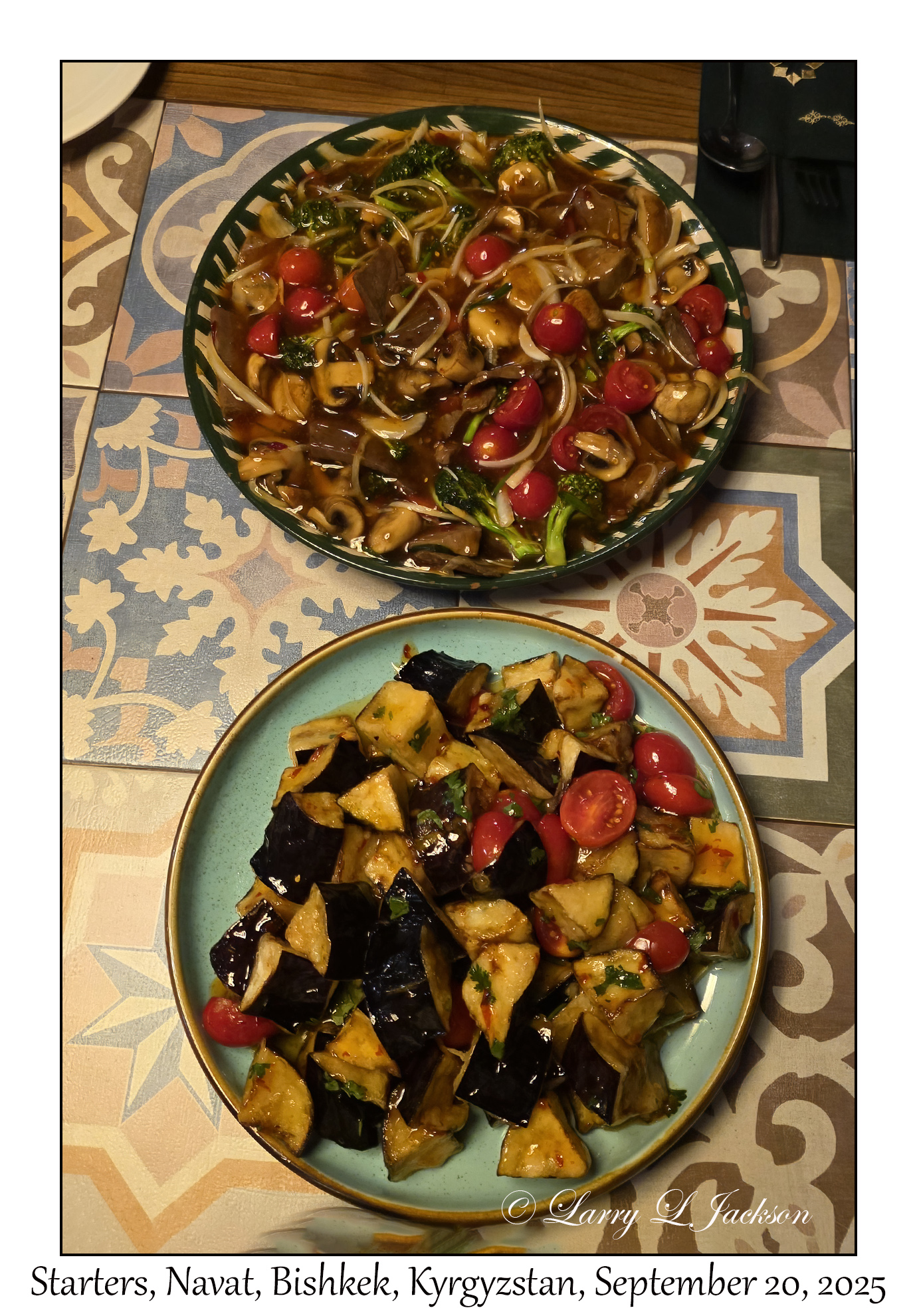 StartersA nice welcome to Kyrgyzstan dinner at another of the Navat restaurants.Navat Restaurant, Bishkek, Kyrgyzstan, September 20, 20252025-09-20#0804Larry L. Jackson