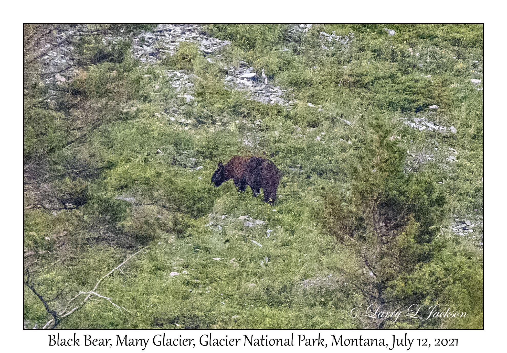 Black BearUrsus americanus - very long distance photo with my longest lens.Many Glacier, Glacier National Park, Montana, July 12, 20212021-07-12#2160Larry L. Jackson